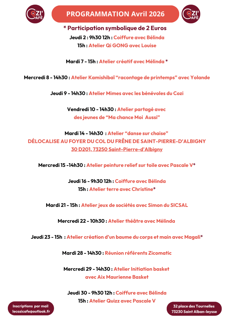 Une participation financière de 2€ à 5€ peut-être demandée selon l’atelier (atelier avec * sur le programme).
